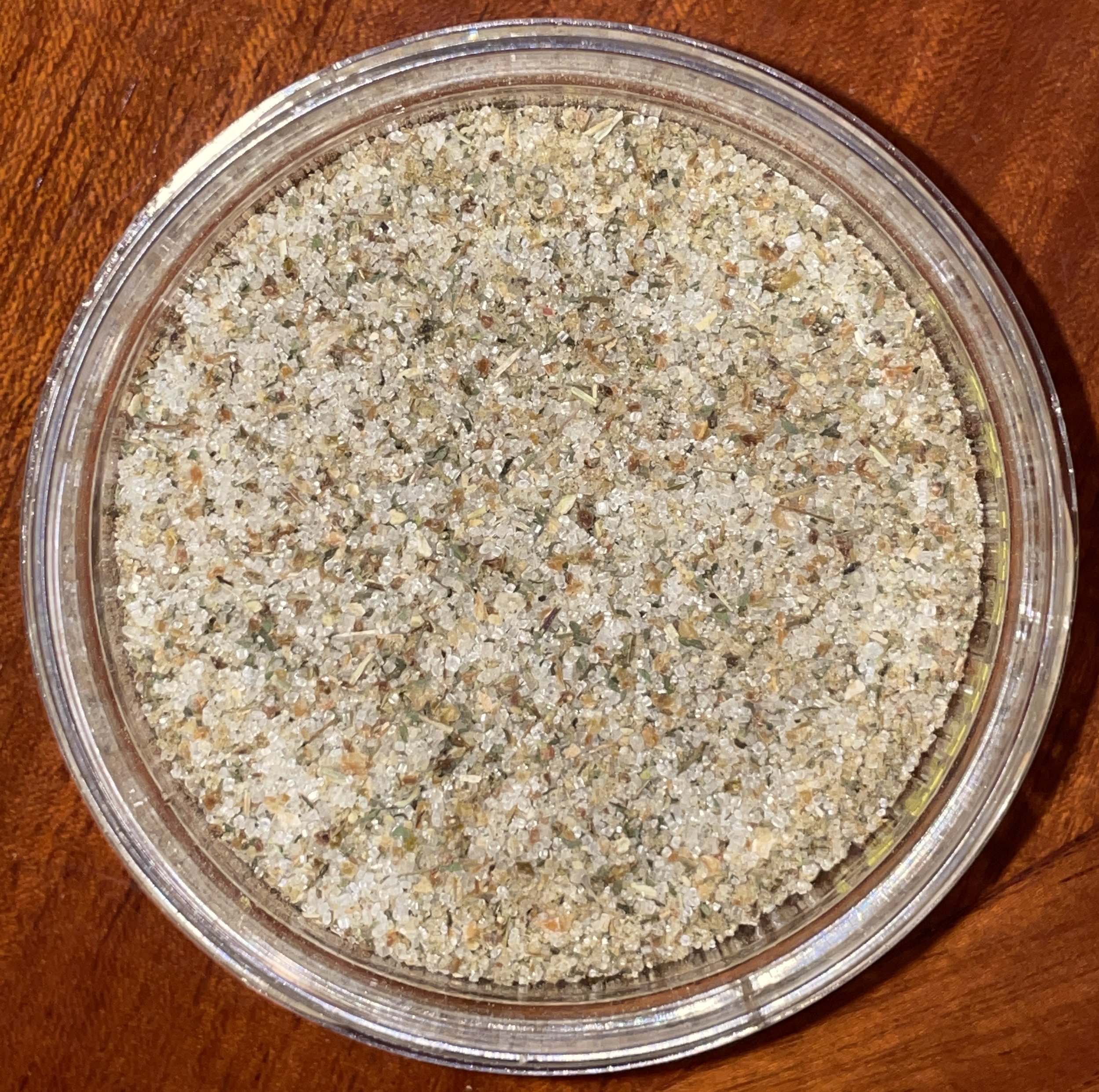 Maintain a medium crystalline texture with visible citrus fragments and fine herb distribution.